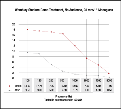 Noise reverberation time can be greatly reduced with a minimal application of Monoglass, as demonstrated in the Wembley Indoor Sport Stadium, Johannesburg, South Africa. Treated with only 1” / 25 mm of Monoglass, the graph (right) depicts the reverberation times with 0% occupancy measured before and after treatment. This shows a considerable reduction in reverberation time over the entire frequency range, which resulted in major improvements in speech intelligibility.