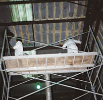 Asbestos is removed under negative building pressure to protect the outside environment. Exposed interior and projections are vacuumed, sealed, and reinsulated with Monoglass®.